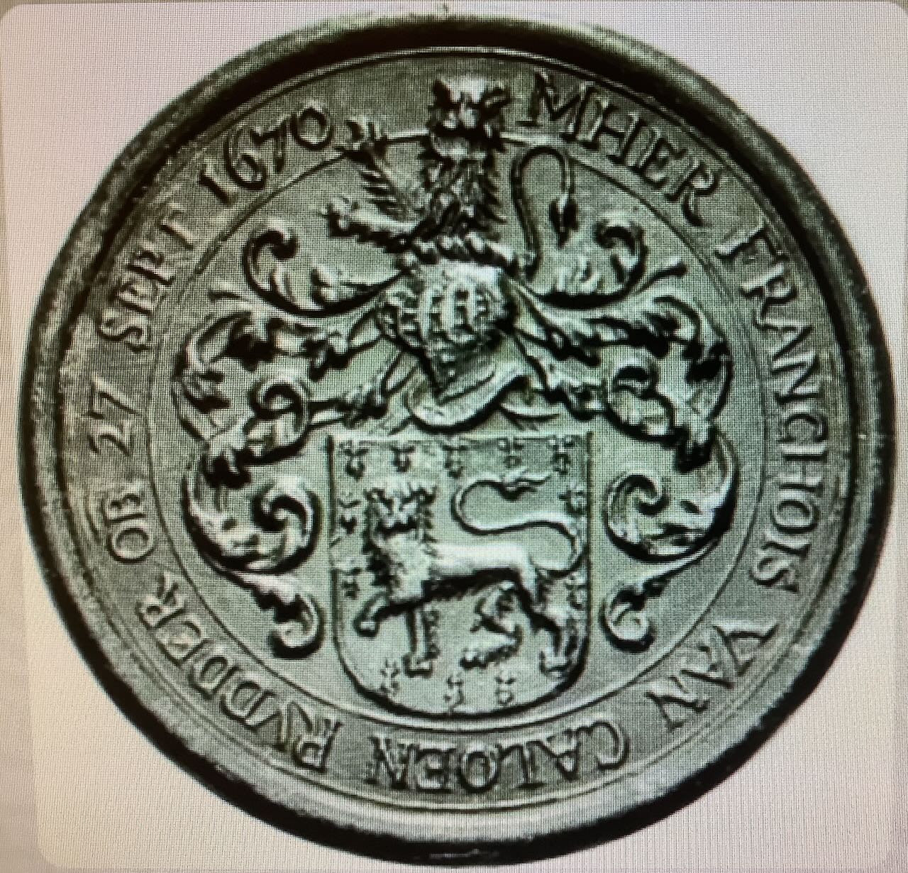 Het object bestaat uit een lood-tin legering en heeft een diameter van 6,5 cm. De aanmaakplaats is Brugge, datering 1670. Beschrijving, voorzijde: Binnen een opstaande boord het wapenschild van de familie van Caloen , voorstellende een luipaard, met erboven een tornooihelm met afhangend helmkleed. Omschrift MHER FRANCHOIS VAN CALOEN RUDDER OB 27 SEPT 1670 (OB= obiit= hij stierf). Keerzijde: Binnen een opstaande boord het alliantiewapen van de families van Caloen en Rommel in een ovaal wapenschild. Omschrift, tussen twee cirkels: VRAVW ANNA ROMMEL (32).