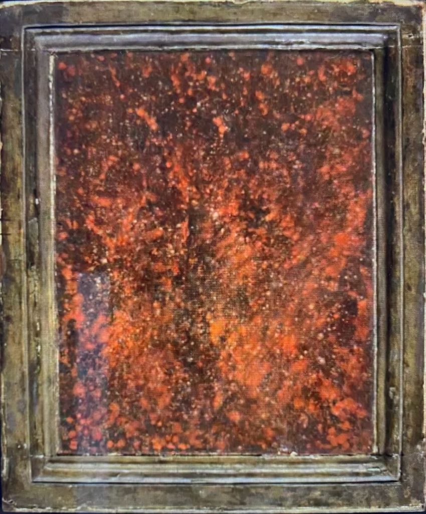 Achterzijde portret Margareta van Eyck. Porfierschildering op ezelsvel gemaroufleerd op het paneel. Groeningemuseum, Brugge.